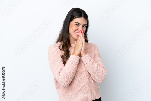 Young Italian woman isolated on white background keeps palm together. Person asks for something