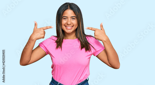 Young latin girl wearing casual clothes smiling cheerful showing and pointing with fingers teeth and mouth. dental health concept.