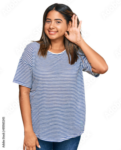 Young latin girl wearing casual clothes smiling with hand over ear listening an hearing to rumor or gossip. deafness concept.