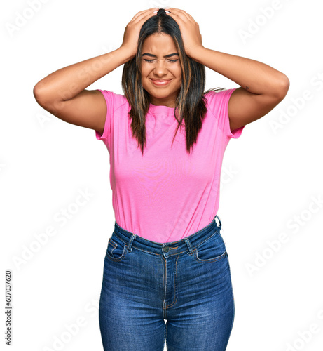 Young latin girl wearing casual clothes suffering from headache desperate and stressed because pain and migraine. hands on head.