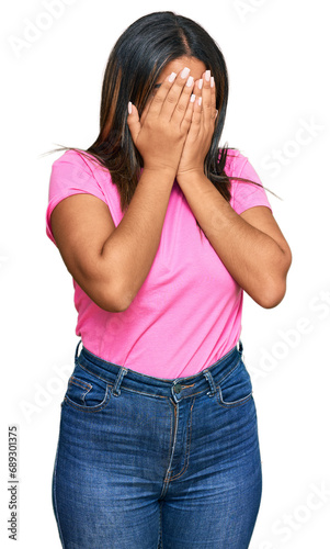 Young latin girl wearing casual clothes with sad expression covering face with hands while crying. depression concept.