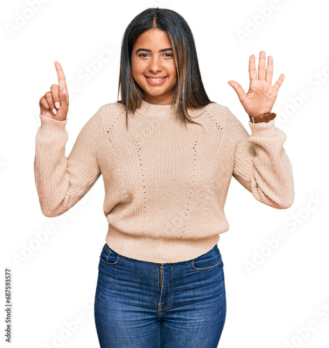 Young latin girl wearing wool winter sweater showing and pointing up with fingers number six while smiling confident and happy.