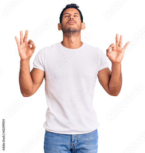 Young latin man wearing casual clothes relaxed and smiling with eyes closed doing meditation gesture with fingers. yoga concept.