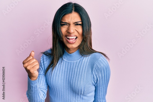 Young latin transsexual transgender woman wearing casual clothes angry and mad raising fist frustrated and furious while shouting with anger. rage and aggressive concept.