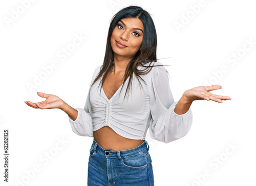 Young latin transsexual transgender woman wearing casual clothes clueless and confused expression with arms and hands raised. doubt concept.