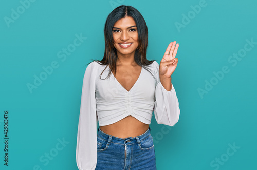 Young latin transsexual transgender woman wearing casual clothes showing and pointing up with fingers number three while smiling confident and happy.