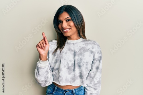 Young latin transsexual transgender woman wearing casual clothes smiling with an idea or question pointing finger up with happy face, number one