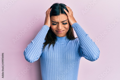 Young latin transsexual transgender woman wearing casual clothes suffering from headache desperate and stressed because pain and migraine. hands on head.
