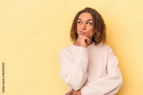Young latin transsexual woman isolated on yellow background relaxed thinking about something looking at a copy space.