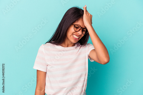 Young latin woman isolated on blue background forgetting something, slapping forehead with palm and closing eyes.