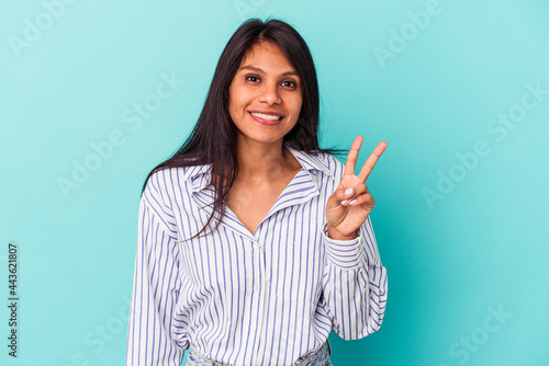 Young latin woman isolated on blue background showing victory sign and smiling broadly.