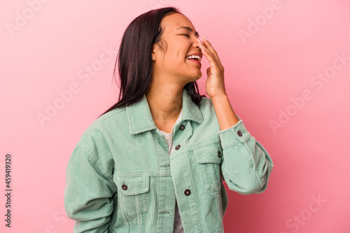 Young latin woman isolated on pink background laughing happy, carefree, natural emotion.