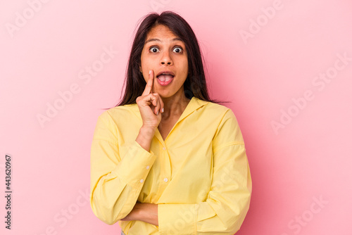 Young latin woman isolated on pink background having some great idea, concept of creativity.