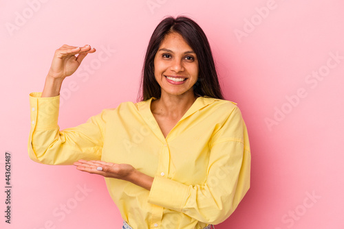 Young latin woman isolated on pink background holding something little with forefingers, smiling and confident.