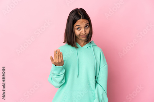 Young latin woman isolated on pink background inviting to come with hand. Happy that you came