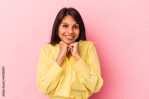 Young latin woman isolated on pink background keeps hands under chin, is looking happily aside.