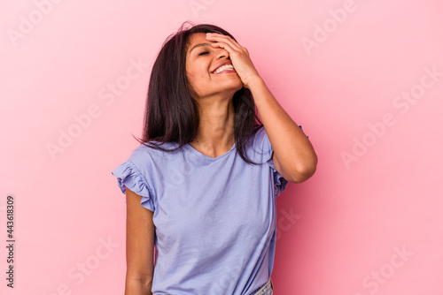 Young latin woman isolated on pink background laughing happy, carefree, natural emotion.