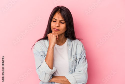 Young latin woman isolated on pink background looking sideways with doubtful and skeptical expression.
