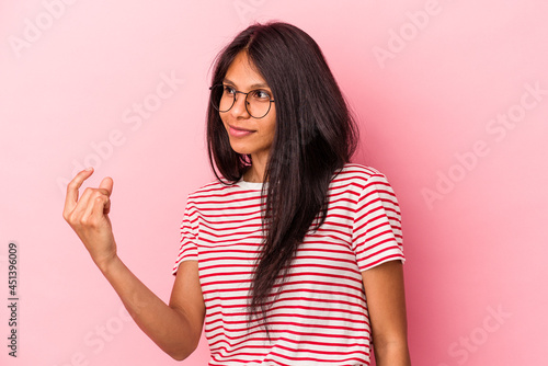 Young latin woman isolated on pink background pointing with finger at you as if inviting come closer.