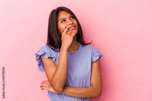 Young latin woman isolated on pink background relaxed thinking about something looking at a copy space.