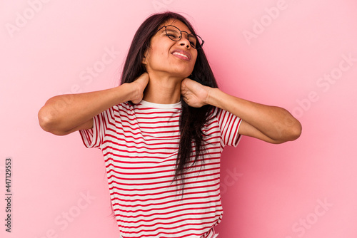 Young latin woman isolated on pink background suffering neck pain due to sedentary lifestyle.