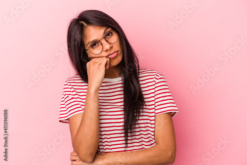 Young latin woman isolated on pink background tired of a repetitive task.