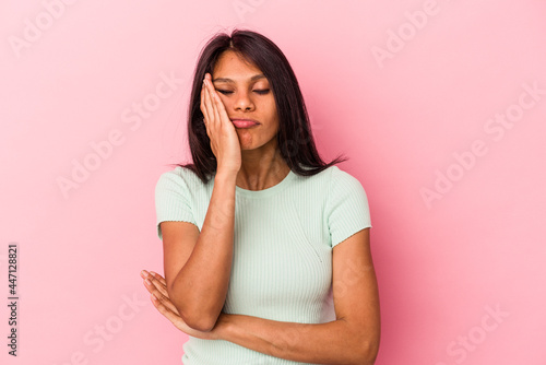 Young latin woman isolated on pink background who is bored, fatigued and need a relax day.