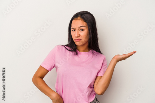Young latin woman isolated on white background doubting and shrugging shoulders in questioning gesture.
