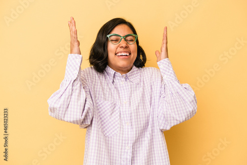 Young latin woman isolated on yellow background joyful laughing a lot. Happiness concept.