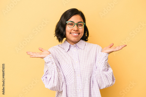 Young latin woman isolated on yellow background makes scale with arms, feels happy and confident.