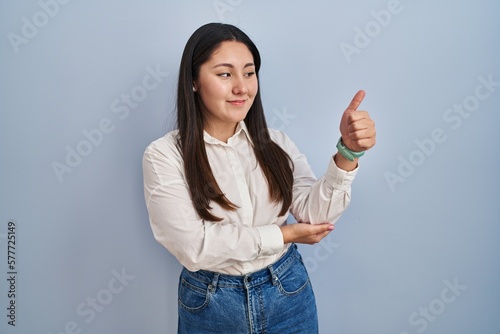 Young latin woman standing over blue background looking proud, smiling doing thumbs up gesture to the side