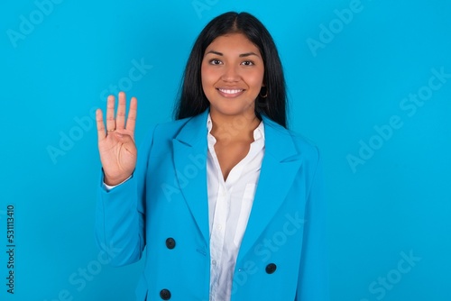 Young latin woman wearing blue blazer blue background showing and pointing up with fingers number four while smiling confident and happy.