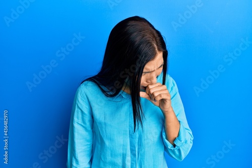 Young latin woman wearing casual clothes feeling unwell and coughing as symptom for cold or bronchitis. health care concept.