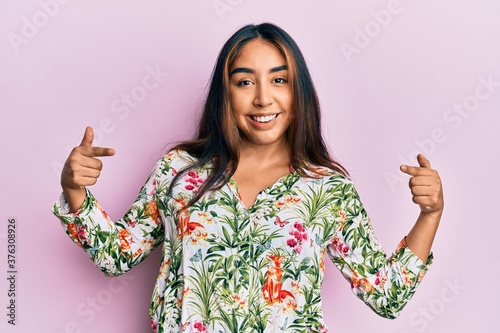 Young latin woman wearing casual clothes looking confident with smile on face, pointing oneself with fingers proud and happy.