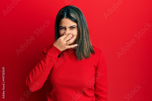 Young latin woman wearing casual clothes smelling something stinky and disgusting, intolerable smell, holding breath with fingers on nose. bad smell