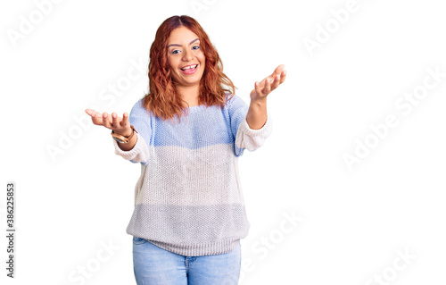 Young latin woman wearing casual clothes smiling cheerful offering hands giving assistance and acceptance.