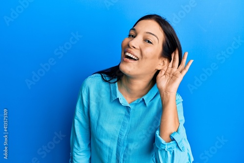 Young latin woman wearing casual clothes smiling with hand over ear listening and hearing to rumor or gossip. deafness concept.