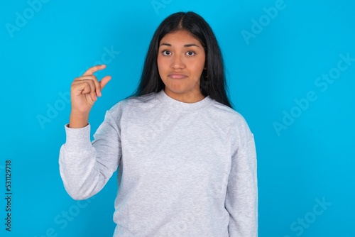 Young latin woman wearing gray sweater blue background purses lip and gestures with hand, shows something very little.