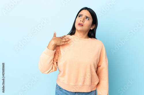 Young latin woman woman isolated on blue background with tired and sick expression