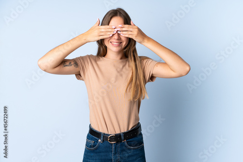 Young Lithuanian woman isolated on blue background covering eyes by hands and smiling