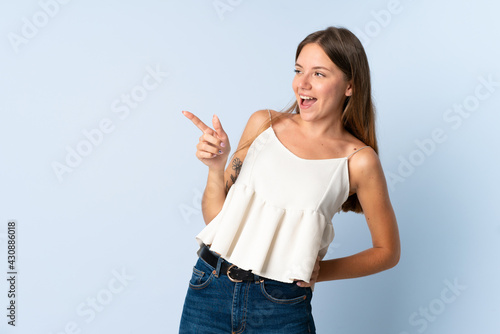 Young Lithuanian woman isolated on blue background pointing finger to the side and presenting a product