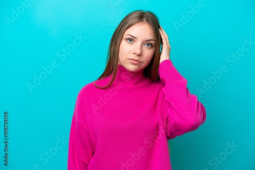 Young Lithuanian woman isolated on blue background with an expression of frustration and not understanding