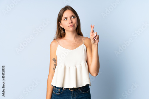 Young Lithuanian woman isolated on blue background with fingers crossing and wishing the best