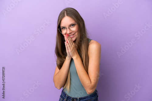 Young Lithuanian woman isolated on purple background keeps palm together. Person asks for something