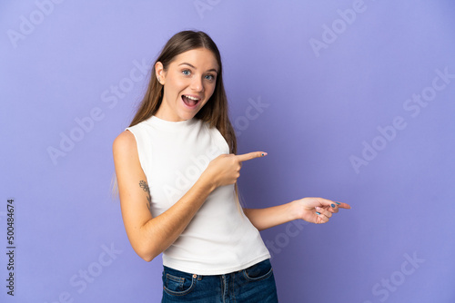 Young Lithuanian woman isolated on purple background surprised and pointing side
