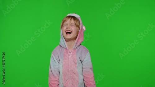 Young little blonde child 5-6 years old in unicorn costume crying with tears on chroma key background. Portrait of kid girl animator in unicorn pajamas. Copy space