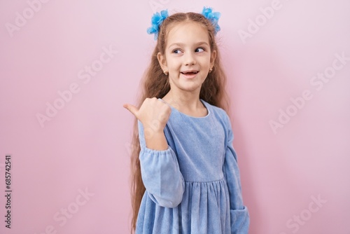 Young little girl standing over pink background smiling with happy face looking and pointing to the side with thumb up.