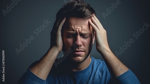 Young male holding his head in home environment. Headache and tiredness. Depressive state. Poor health and symptoms of a cold