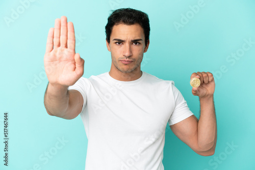 Young man holding a Bitcoin over isolated blue background making stop gesture