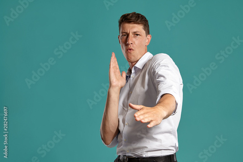 Young man in a classic white shirt is posing over a blue background.